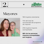 El programa que cuenta con mayor número de mujeres es el de acompañamiento a mayores, tanto en su número de voluntarias como en el de personas acompañadas. La población envejecida es fundamentalmente mujer y el 88% de los casos de acompañamiento se hace visitando a mujeres mayores en situación de soledad no deseada. El grupo de voluntariado está formado por 190 mujeres y 67 hombres (un 74% de mujeres).