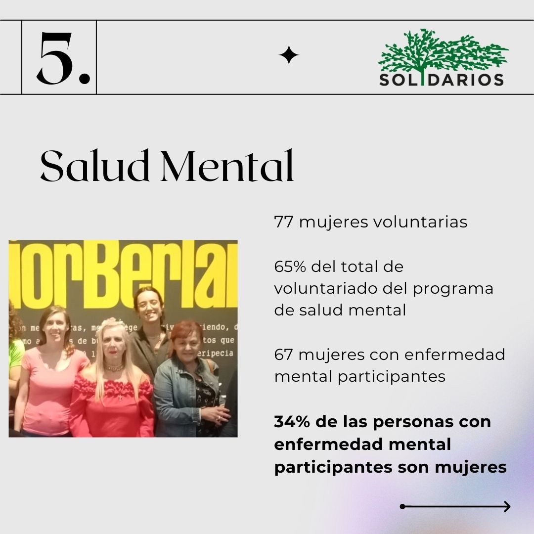 En los programas de Salud Mental y personas Sin Hogar la participación de mujeres voluntarias ronda el 62% mientras que la presencia de mujeres con trastorno mental en los grupos de ocio, en los talleres de los espacios de encuentro o en las rutas de calle es fundamentalmente masculina, aunque va creciendo poco a poco. En Salud Mental son un 34% las mujeres que acuden a los grupos y en el programa de personas sin hogar un 27 % del total de personas atendidas son mujeres.