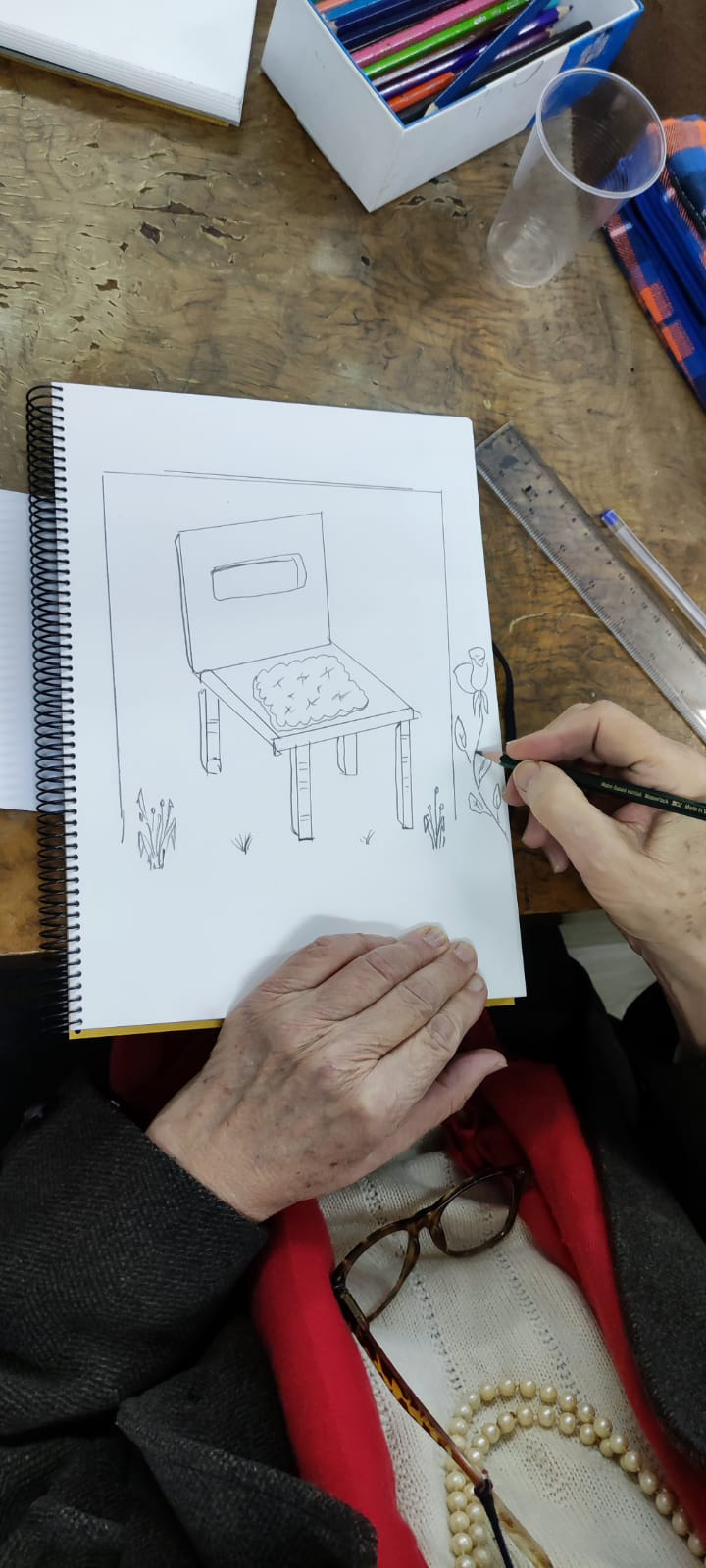 Todos los jueves, un pequeño grupo de unas 15 personas se reúnen en la sede de Solidarios en Ciudad Universitaria, en Madrid, como parte de la iniciativa RE|CREA que promueve el acceso de personas sin hogar a espacios de ocio cotidianos donde generar comunidad. Con el apoyo de la Fundación QBE se ha puesto en marcha este espacio de encuentro con este taller de arte, donde personas voluntarias y personas sin hogar que duermen en el Albergue San Isidro, aprenden a expresarse, a dibujar, a charlar y a estar juntos.
