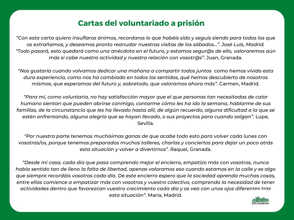 En los centros penitenciarios Sevilla I, El Albolote (Granada), Campos del Río (Murcia), Valdemoro y Soto del Real (ambos en Madrid), las voluntarias y voluntarios que participan en las Aulas de Cultura han escrito cartas que, con la colaboración de las autoridades de cada centro, se imprimen y colocan en los tablones de los diferentes módulos. En ellas se envían mensajes de apoyo y de aliento para que las personas internas sobrelleven mejor la imposibilidad de recibir visitas y tener encuentros vis a vis con sus personas allegadas. A través del funcionariado se recopilarán las respuestas que puedan escribir las personas internas y se harán llegar escaneadas a cada delegación. Se trata de cartas de ánimo generales, no dirigidas a personas en particular.