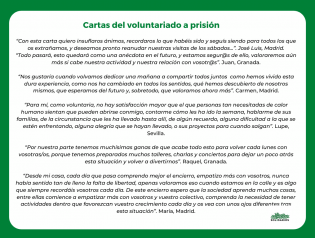 “Con esta carta quiero insuflaros ánimos, recordaros lo que habéis sido y seguís siendo para todos los que os extrañamos, y deseamos pronto reanudar nuestras visitas de los sábados…”. José Luis, Madrid.