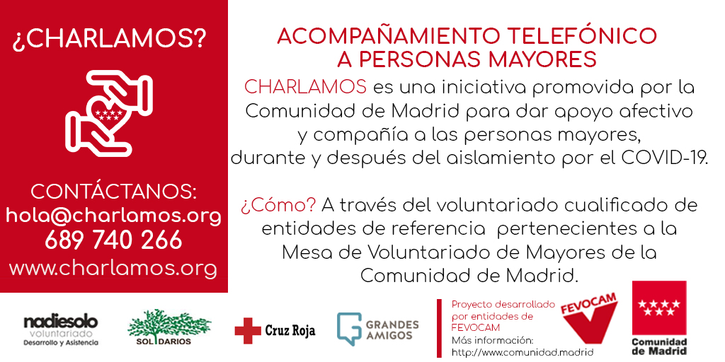 Grandes Amigos, Solidarios para el Desarrollo, Nadiesolo Voluntariado y Cruz Roja se encargarán de atender el servicio con voluntarios y voluntarias especializados, formados, comprometidos y con experiencia en el trabajo con personas mayores. Todas forman parte de la FEVOCAM – Plataforma de Entidades de Voluntariado de la Comunidad de Madrid. Para todas estas organizaciones es importante la cooperación con las administraciones públicas para dar una respuesta conjunta a las necesidades de las personas mayores en situación de aislamiento y soledad.