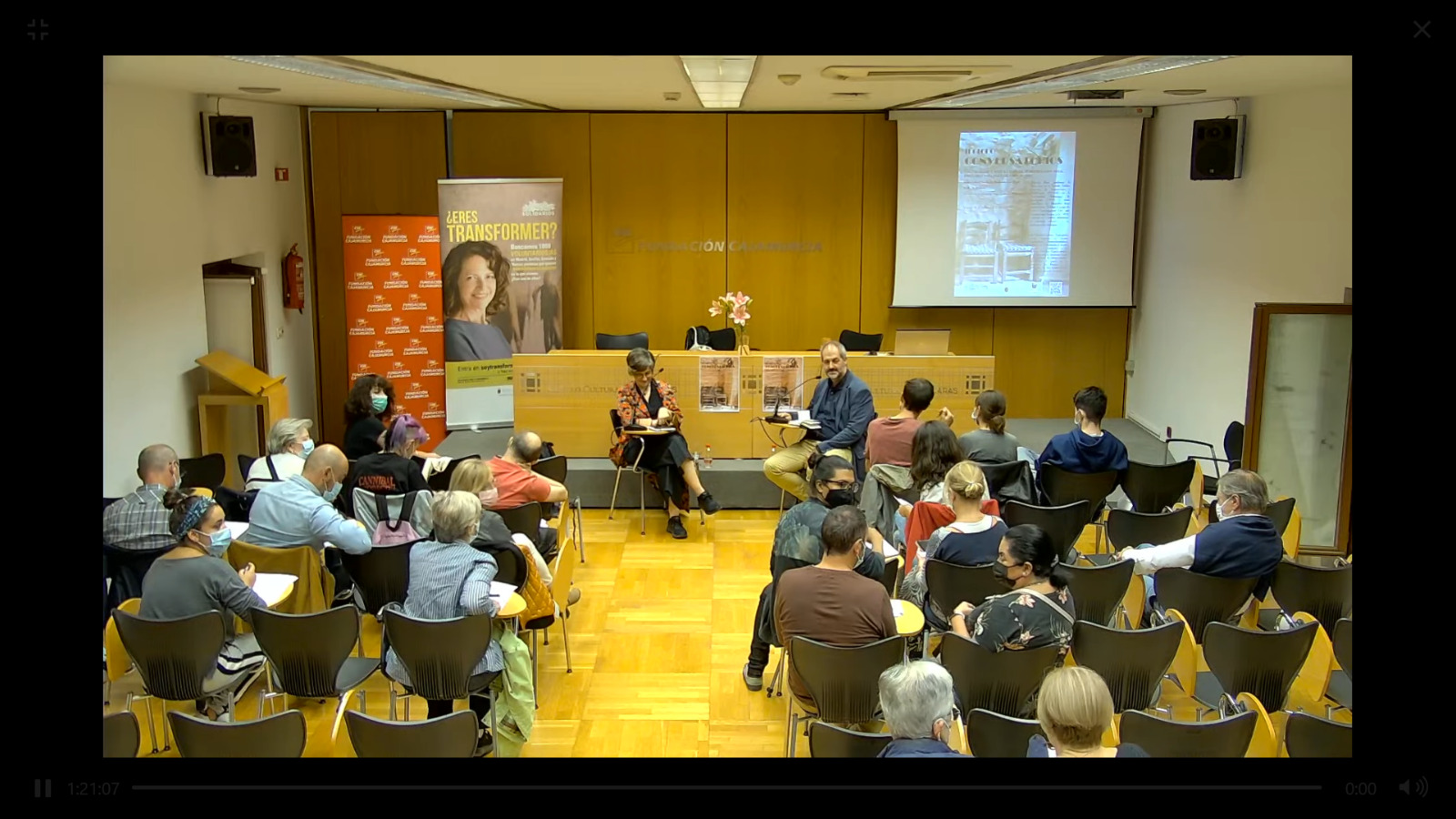 En torno a los CUIDADOS, Patricia Reus y José Manuel Latorre dialogaron durante hora y media con la activa participación del público en el Centro Cultural Las Claras de la Fundación Caja Murcia, aunque también se pudo seguir por streaming.