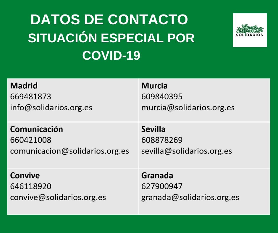 Debido a la situación dada por el Covid-19 y ante el cierre de las instalaciones donde tenemos nuestras oficinas, el equipo de Solidarios para el Desarrollo estará teletrabajando hasta que las autoridades oficiales recomienden y decreten la vuelta a la normalidad. Ponemos a vuestra disposición nuestros datos de contacto por cualquier situación que requiera nuestra atención.