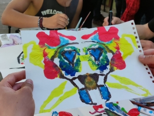 La simetría crea extrañas formas a las que la mente enseguida da un sentido (es la base del test de Rorschach). Cada uno se encuentra en un punto de partida diferente y desarrolla su obra basándose en estas manchas formadas por la acuarela líquida. La imaginación hace el resto. Pronto el patio se llenó de insectos, frutas, dragones, figuras humanas… La curiosidad invita a observar los que hacen los demás, el ambiente se distiende y la interacción es más dinámica y fluida. El factor lúdico y la sorpresa propiciaron la diversión y suplieron la falta de técnica o pericia con los materiales artísticos. Cada uno sacó al artista que lleva dentro, sin el complejo de no saber, porque imaginación y ganas de inventar tenemos todos y todas. Los resultados a la vista están.