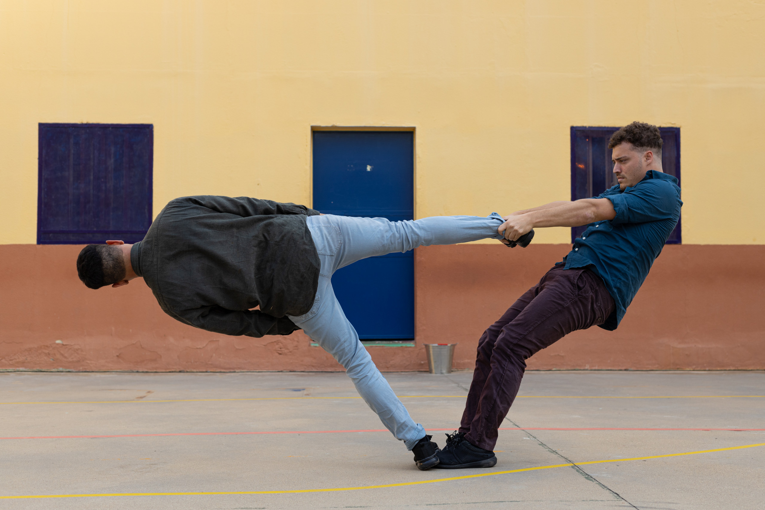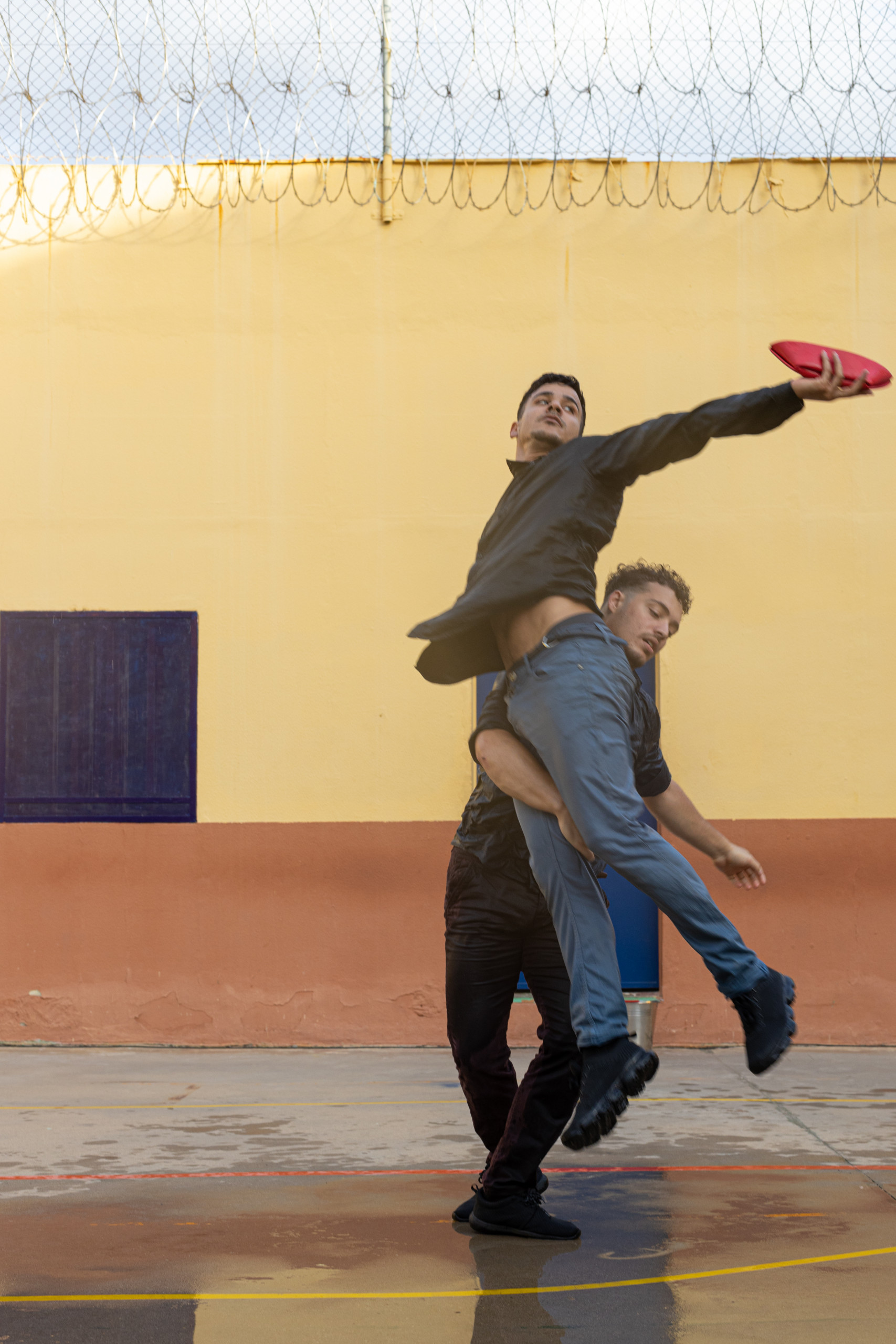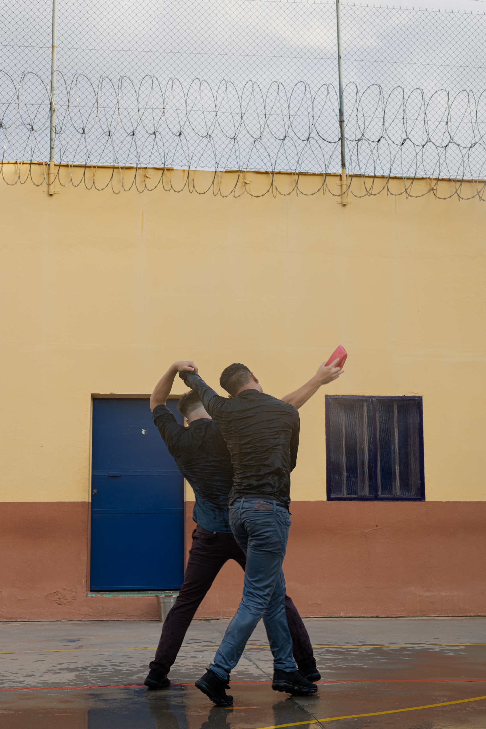 Nada más entrar en el módulo el silencio del patio y las caras de los internos entre los barrotes de las ventanas de sus “chabolos” nos dejó a todos sobrecogidos… Poco a poco fueron bajando tras la llamada de rigor y se fueron acomodando en el suelo de su propio patio como si estuvieran fuera de prisión, viendo un espectáculo de calle del festival. Curiosidad ante la situación, una escenografía simple pero muy significativa, tres cubos llenos de agua. Todos se preguntaban “qué iba a pasar”.