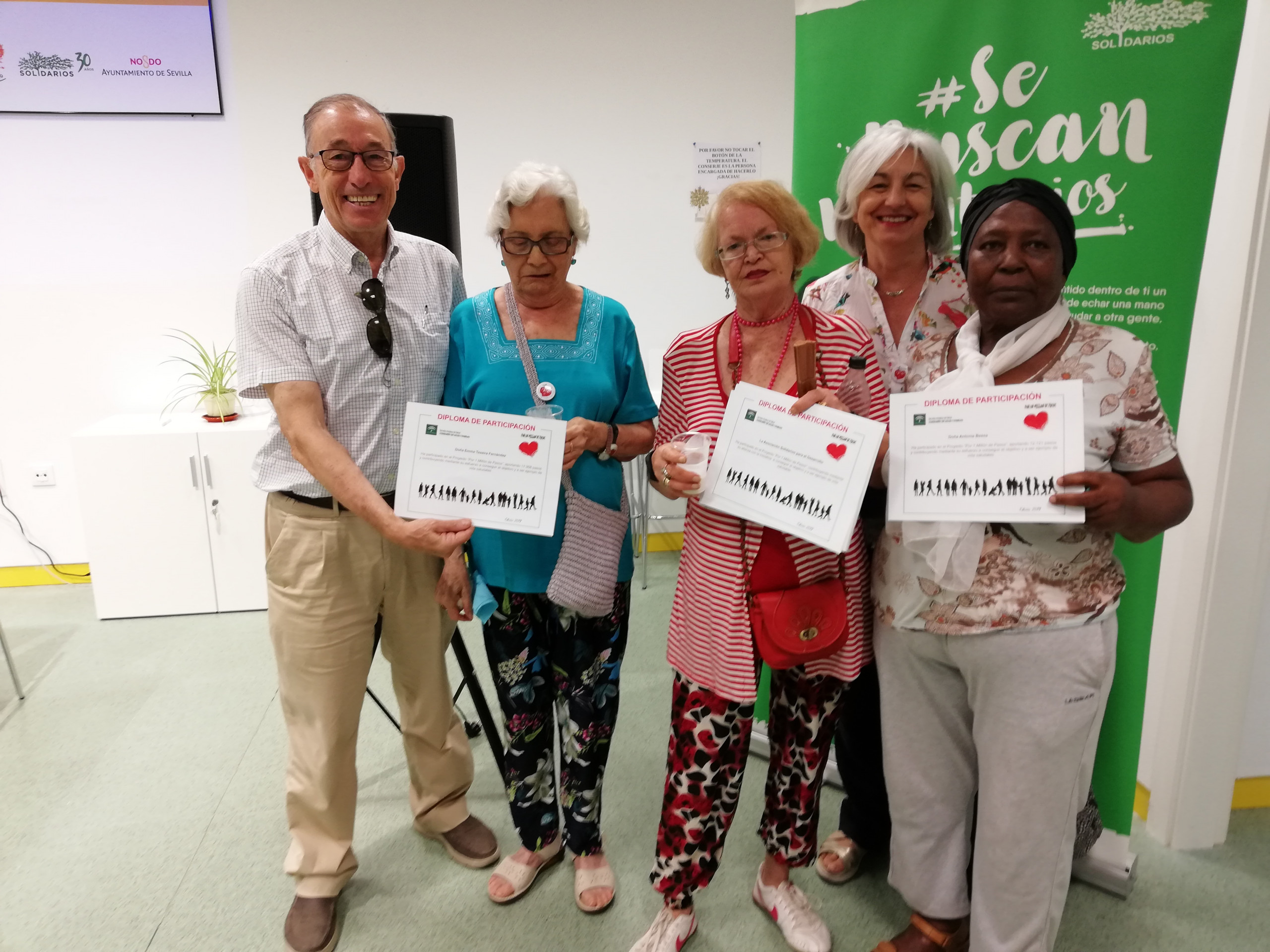 Las personas voluntarias del programa de acompañamiento a personas mayores de Solidarios para el Desarrollo, junto a las personas mayores acompañadas y usuarios del CPA, recibieron por parte de la Comisionada del Polígono Sur, María del Mar González, sus diplomas correspondientes con un total de 1.276.010 pasos conseguidos en tres marchas que les han dado la oportunidad de conocer los activos en salud presentes en el Polígono Sur.