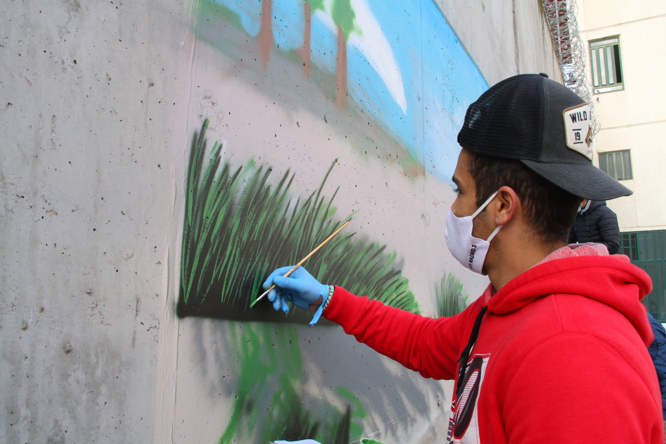 Esta acción solidaria pretende también despertar inquietudes y talentos que les puedan servir en el día de mañana con las herramientas necesarias como opción laboral. El grupo de participantes se ha mostrado muy colaborativo para crear este mural de unos 25 metros cuadrados que decora, desde hoy, el patio del módulo 6 del Centro Penitenciario Madrid III. “Un mural así le va a dar mucha vida al módulo”, afirmaba ilusionado Aziz, uno de los internos participantes en la creación. Junto a un equipo de muralistas profesionales de Taruga, han plasmado en la pared un paisaje gigante de una playa con islas y palmeras de fondo. Un colorido e inspirador mural que les servirá de evasión durante el tiempo que les quede de condena.