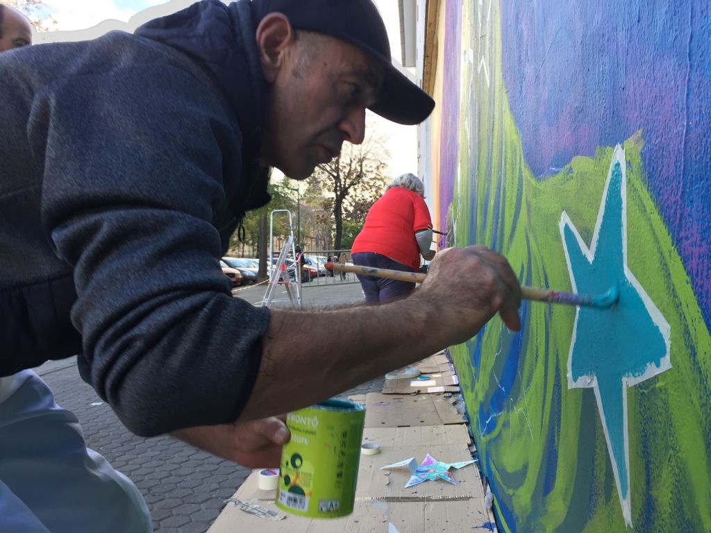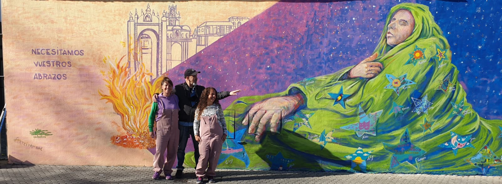Vivir a cielo abierto. Ese ha sido el eslogan con el que hemos trabajado todo el verano. Una realidad que muchas personas sin hogar viven día a día. Juntos hemos experimentado, plasmado e indagado para darle forma y visibilidad a esta situación y este es el resultado del proceso creativo. Un mural donde se muestra esta realidad, donde se hace visible que todos tenemos sueños y todos necesitamos los abrazos de quienes nos rodean. Tanto el diseño como la ejecución ha sido realizada por los usuarios de Solidarios. La experiencia preciosa. Compromiso, entusiasmo, alegría, cariño…y mucho arte. Gracias al grupo motor Maria Luisa, José y Eloy y gracias a la participación de cada una de las personas, que han sido muchísimas, q con tanto amor pusieron su pincelada de color. Manu, Joaquín, Tamara, Antonio, Charo, Rosa, Emilia, Aly, Doina, Juanma, Inma, Maca, Marta, Estrella, Ana, Juanjo, Ángel, Alicia y Tamara. Y no nos olvidamos dar las gracias a la gente del barrio que han recibido nuestro trabajo con tanta ilusión y admiración.